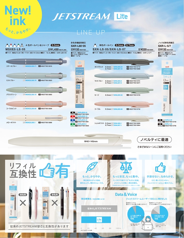 「クセになる、なめらかな書き味。」を実現する、世界初の画期的なインクシリーズから、よりかろやかな書き味の『JETSTREAM Lite touch ink』を新開発。
